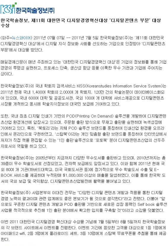 제11회 대한민국 디지털경영혁신대상 '디지털콘텐츠 부문'대상수상