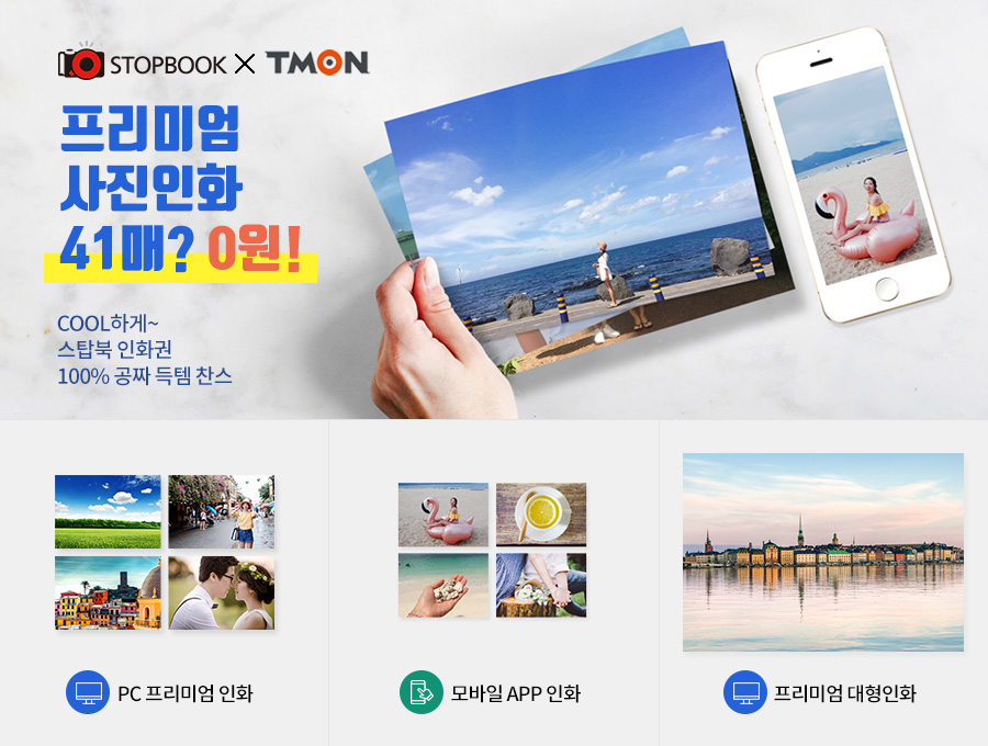 스탑북, 티몬서 프리미엄 사진인화 41매 0원 이벤트 진행