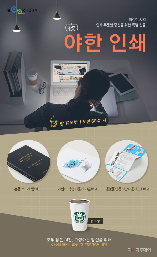 아시아투데이 오세은 기자 = 온라인 인쇄 전문업체 북토리는 20일 새벽 시간 인쇄 주문 고객을 대상으로 경품 이벤트를 진행한다고 밝혔다. 야(夜)한 인쇄로 불리는 이번 이벤트는 학위논문, 보고서 등의 인쇄를 위해 늦은 시간까지 북토리를 찾는 고객들에게 감사의 뜻을 전하고, 심야인쇄를 알리고자 기획됐다. 참여 방법은 심야인 자정부터 오전 6시 사이에 주문 결제 완료 후 이벤트 참여 댓글을 달면 자동으로 응모되며, 추첨을 통해 선발된 50명의 당첨자에게는 스타벅스 아메리카노 기프티콘을 증정한다. 대부분의 인쇄업체는 평일 오전 9시부터 오후 6시까지만 인쇄 접수를 받으나 북토리는 시간·장소와 관계없이 24시간 접수가 가능하다. 온라인 주문 시스템을 기반으로 고객이 직접 주문접수, 배송 확인 등 실시간으로 확인할 수 있기 때문이다. 북토리는 주문형 제작(POD, Print on Demand) 솔루션을 통해 최적의 제작 방식을 결정하고, 인쇄 전문가가 품질을 책임지고 있다.