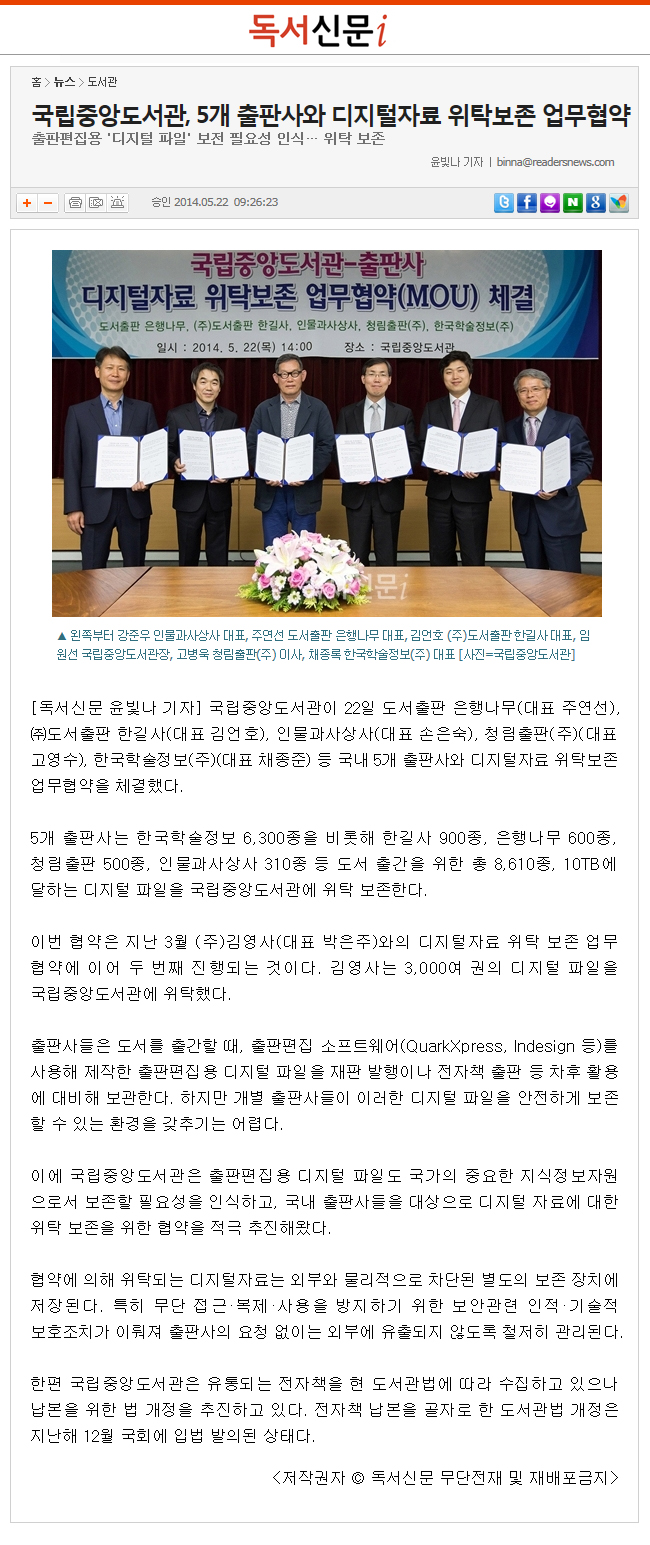 국립중앙도서관, 5개 출판사와 디지털자료 위탁보존 업무협약